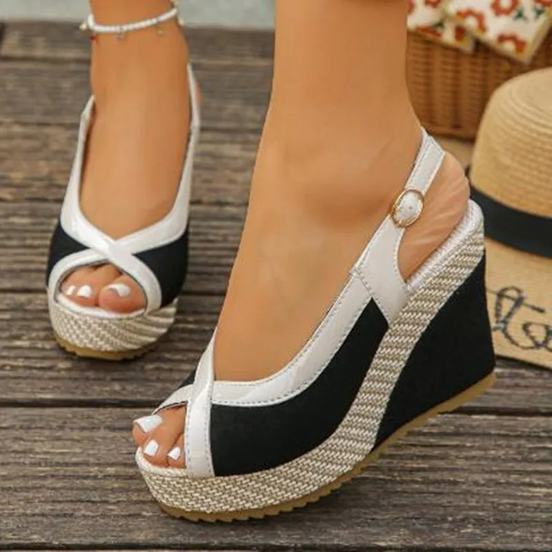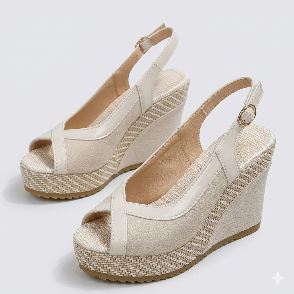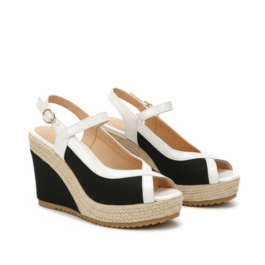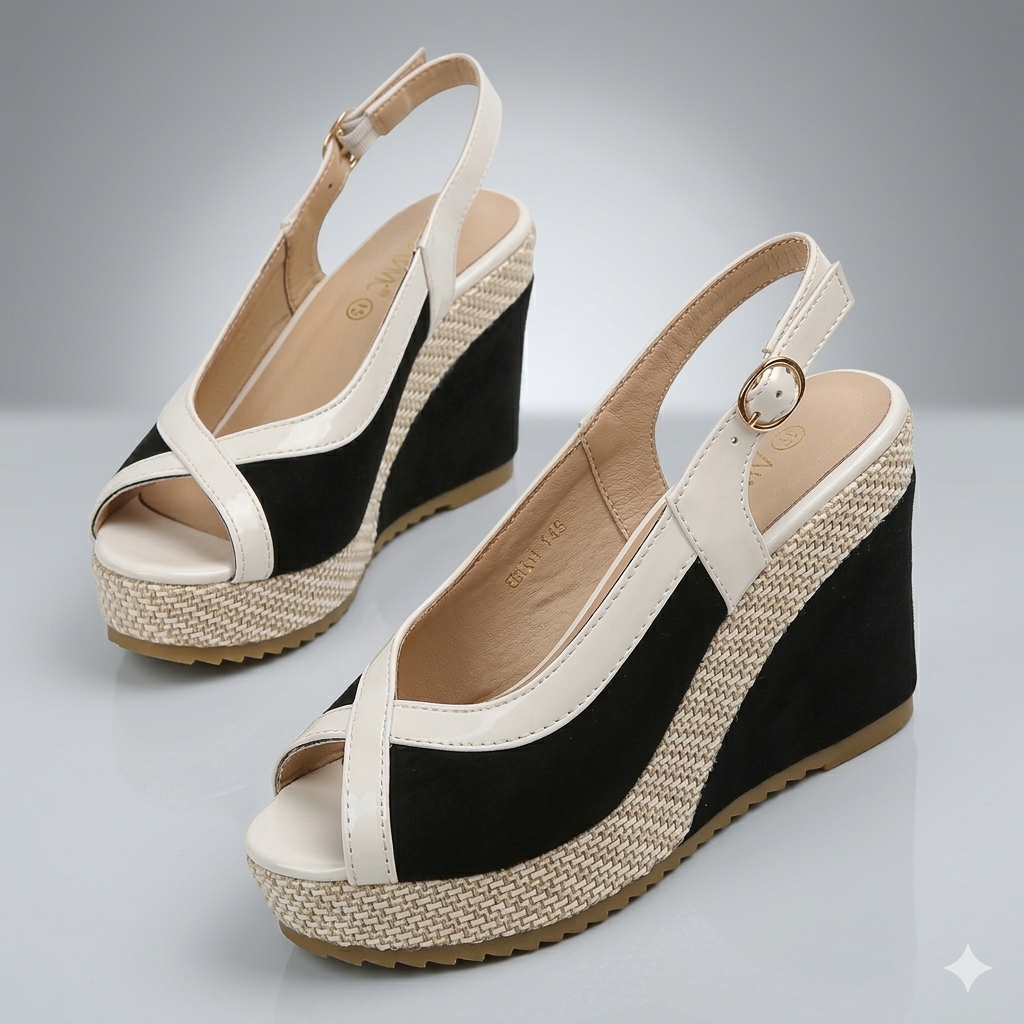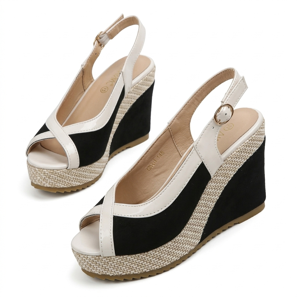 Conçue avec une semelle compensée structurée et une tige contrastée, cette sandale présente un croisement de lanières à l'avant et une fermeture sécurisée à la cheville. La hauteur équilibrée et la base solide lui confèrent un profil stable et surélevé.