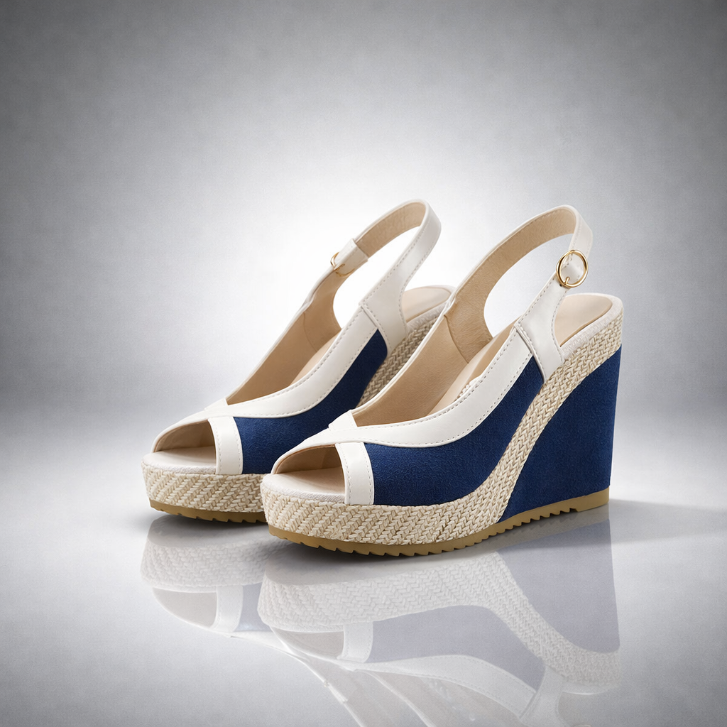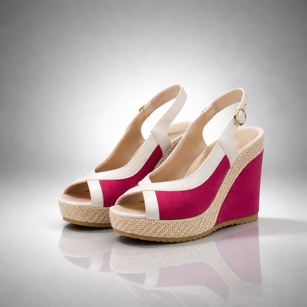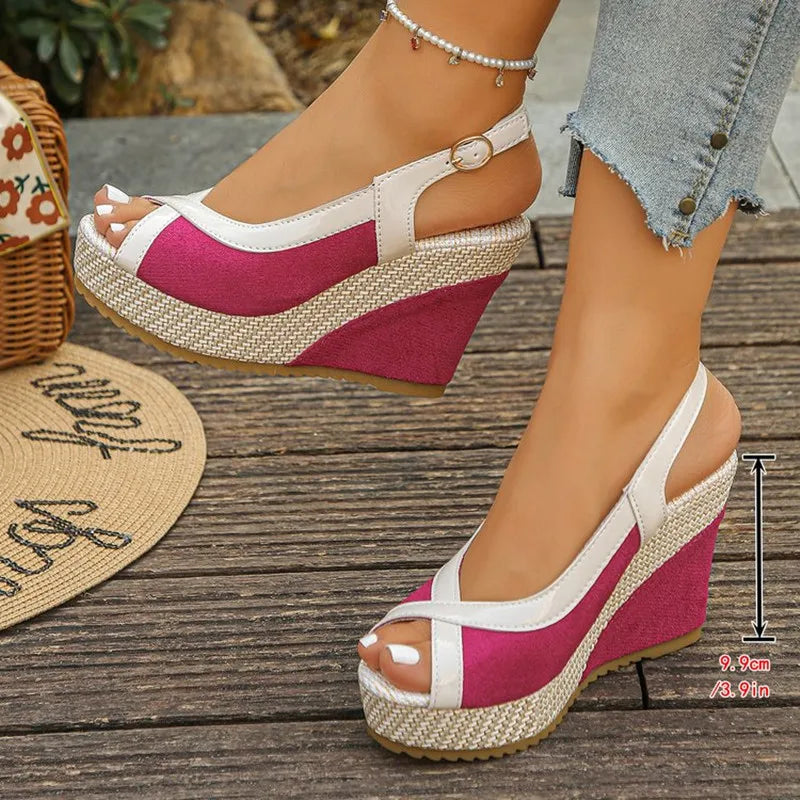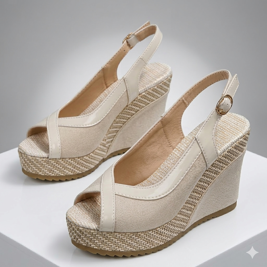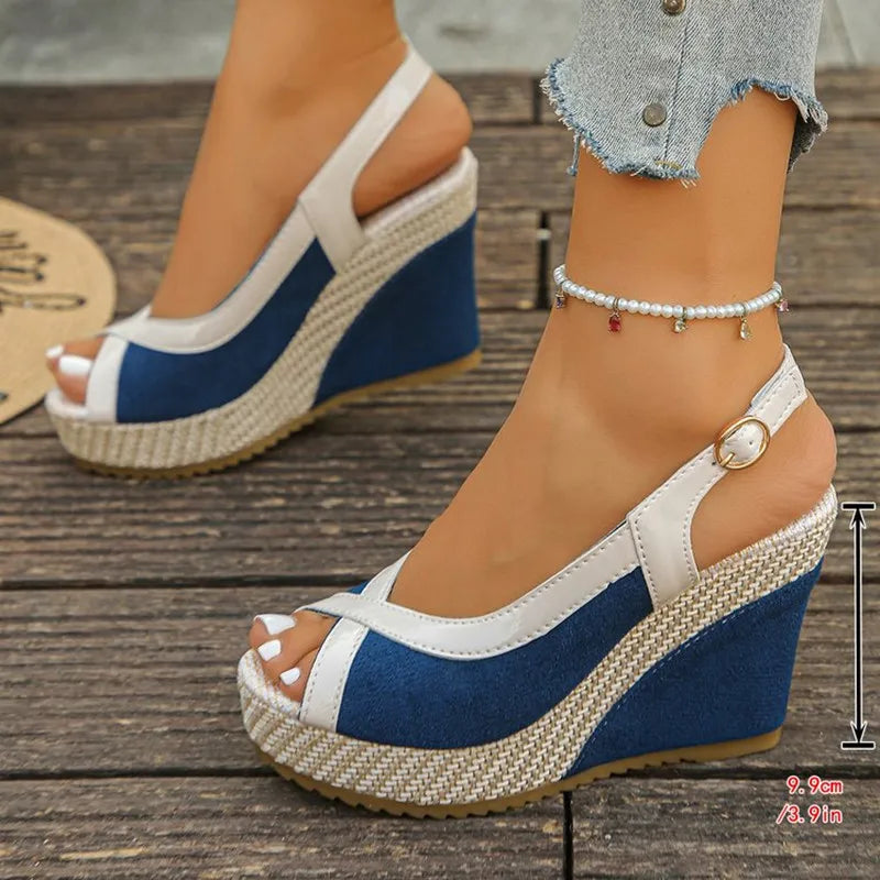 Conçue avec une semelle compensée structurée et une tige contrastée, cette sandale présente un croisement de lanières à l'avant et une fermeture sécurisée à la cheville. La hauteur équilibrée et la base solide lui confèrent un profil stable et surélevé.